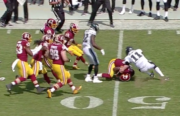 The Redskins’ second touchdown when Chris Thompson evaded 11 EAGLES TACKLERS was embarrassing and easy to ridicule. But other than that the defense played excellent. Kirk Cousins was under pressure all day and though he never reached full Eli Manning, he was never able to get comfortable in the pocket. I actually thought he played well given the circumstances. He’s a gamer, and he used his legs late in the game to keep the Redskins in it. But all the credit in the world goes to the outstanding defensive line, which got pressure on almost every play. And when Jim Schwartz did decide to Blitz, linebackers and secondary players got in the backfield almost at will. So while we’ll remember the play with the missed tackles, it’s worth noting that it was a rare miscue from an otherwise excellent defensive effort, capped off by Fletcher Cox recovering an incomplete pass and running into the end zone like a fat duck.