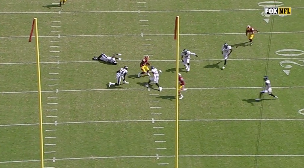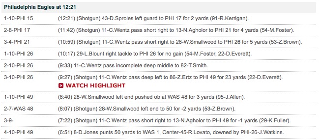 I thought Wentz played well overall. He completed 26-of-39 passes for 302 yards, two touchdowns and one interception. That’s hard to argue with. However, he still overthrows receivers. Those passes usually come on “touch” throws. I thought at times he still looked a little raw – more than I was expecting heading into his second season – and didn’t work through his progressions as well as he should. Here’s an example from a play fake to Smallwood:
