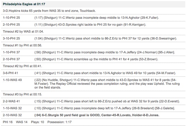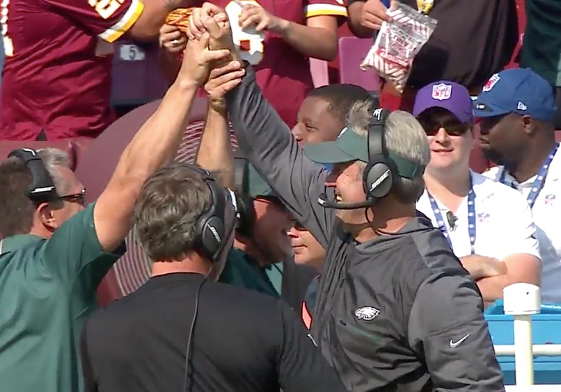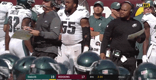 The two-point conversion came likely because Caleb Sturgis hurt his hip and had already missed a PAT earlier in the game, so I’ll give Doug the benefit of the doubt here. But since “math” was such a big topic last week, mentioned both in Jeffery Lurie’s and Pederson’s press conferences, it’s worth pointing out that this was probably the wrong decision. Kicking the PAT would’ve put the Eagles up 12 and meant the Redskins had to score two touchdowns. Had the Eagles not converted the two-point conversion, then the Redskins would’ve only need a touchdown with two-point conversion and field goal to tie. So, mathematically speaking, this is not a situation to go for it.