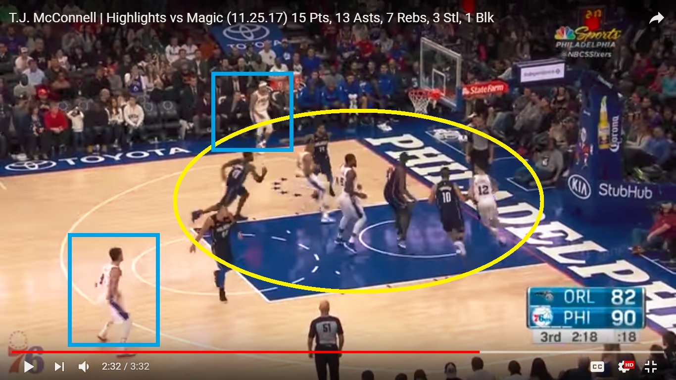 At the point where McConnell is under the rim, he has the attention of all five Orlando players. Jerryd Bayless and Dario Saric space out on the perimeter: