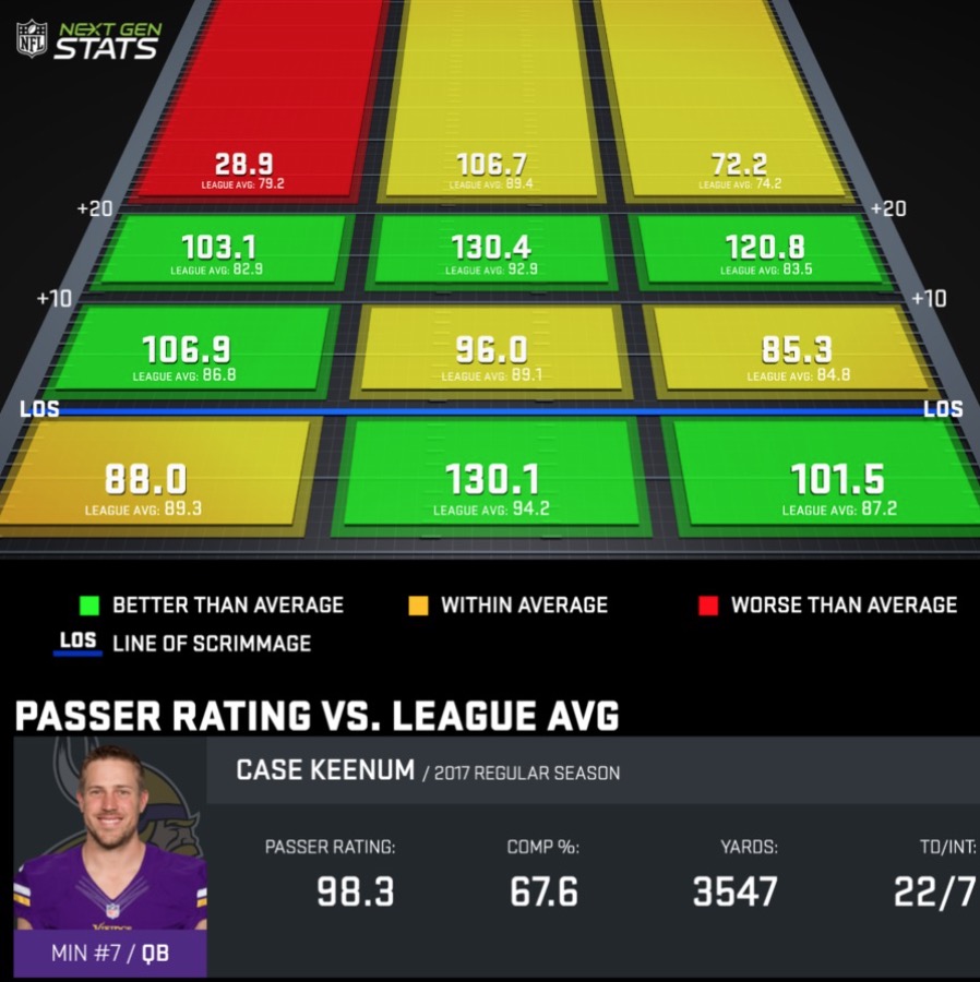 There’s a reason why the Vikings’ offense relies on its mediocre ground game – they are 22nd in rush yards per attempt – and it’s because a conservative, clock-chewing approach is the only way to prevent Keenum from exposing himself as a downfield passer. He was average or worse on passes over 20 yards this season: