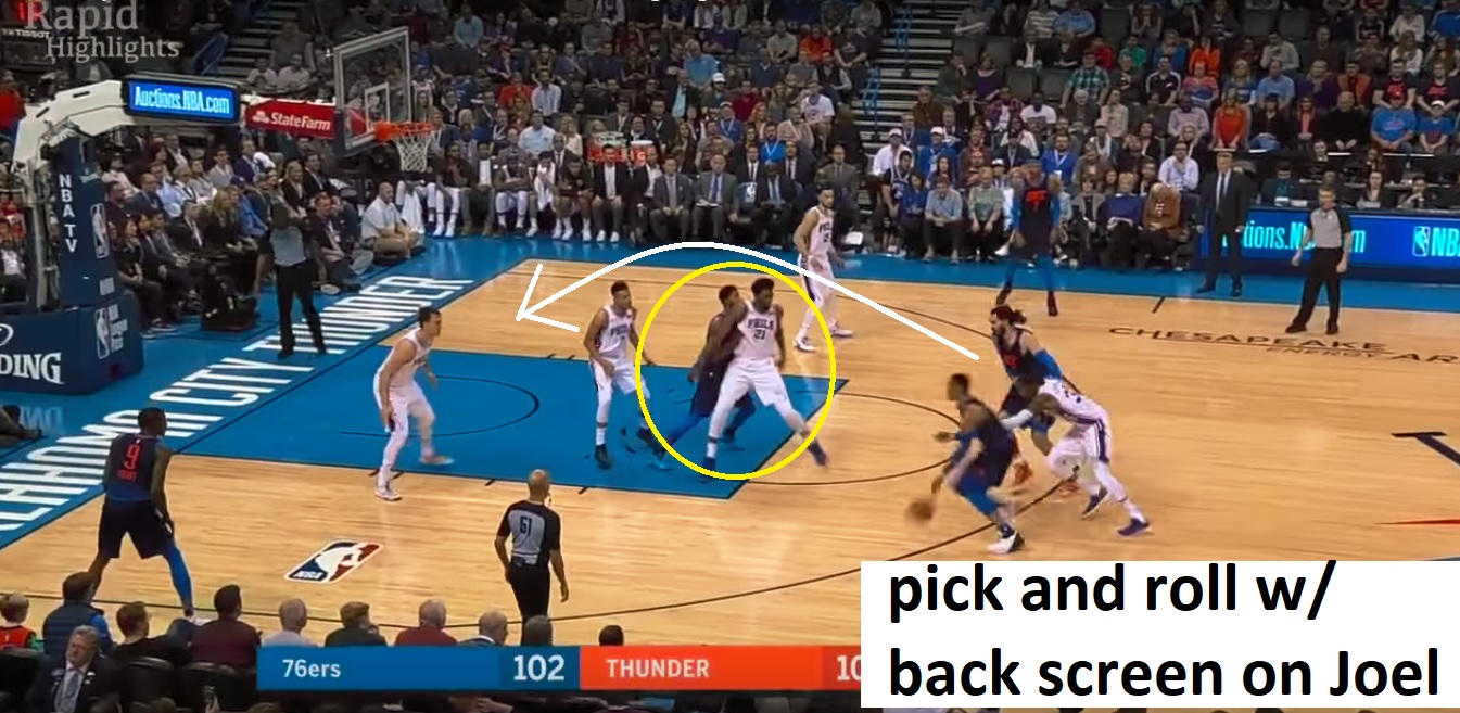 But on the second, with Embiid in the game, he tries to sag to the elbow or “zone” the play, and OKC actually throws a third guy into the mix, setting a back screen and sealing off Joel for Westbrook to lob it up to Adams: