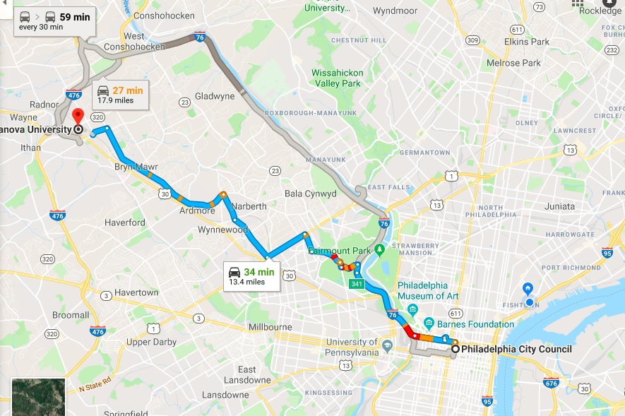 Using City Hall as a central location, Nova’s campus is about 13 to 14 miles from center city if you’re taking a straight-ish shot down Lancaster Avenue: