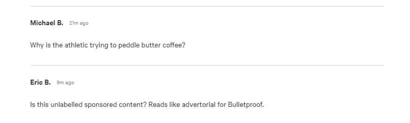 Ley closes his story by saying, “Everything about sports media is so embarrassing,” which is a bit dramatic. Is there some nefarious arrangement between Bulletproof Coffee and The Athletic to promote this product on a platform that requires a paid subscription to access? That would be somewhat myopic, if true.