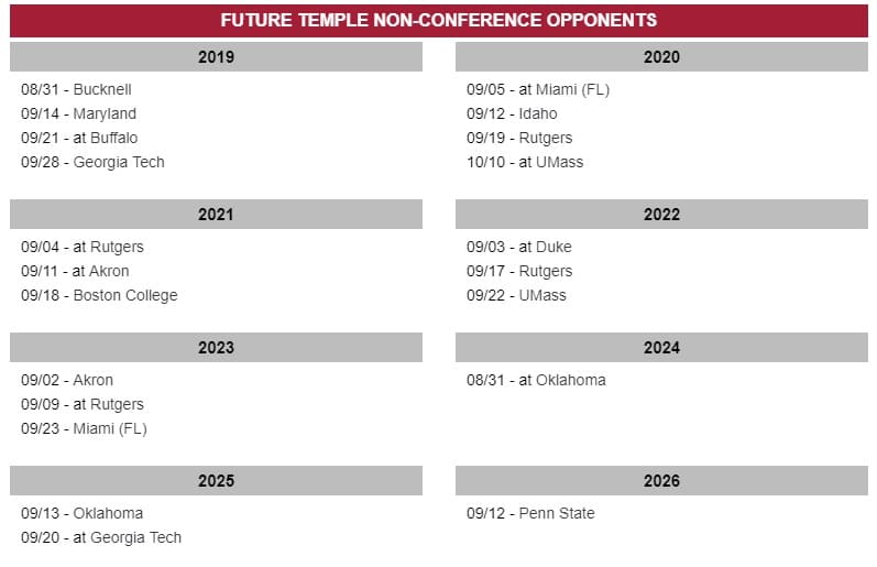 For instance, Temple gets Georgia Tech and Maryland at home this year, two Power Five conference schools at the Linc. That’s in addition to their AAC slate, which includes #17 UCF. Then, in the future, the Owls will face these non-conference opponents: