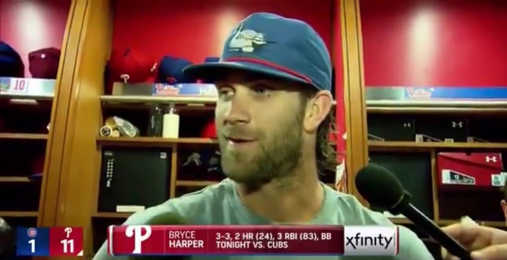About 20 minutes after the Phillies’ 11-1 blowout win over the Cubs last night, a jovial Bryce Harper stood before reporters to answer questions about his two homers, Charlie Manuel’s debut as hitting coach, and the other usual assortment of questions he typically receives, but I couldn’t focus on any of his answers.
