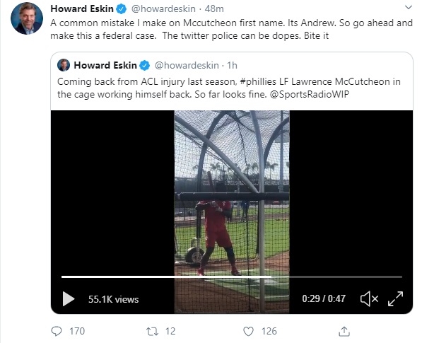Sometimes he has trouble navigating Twitter, however, such as the instance last week where he ripped the wrong Jessica Mendoza twice, before correcting himself. Today, he made the common mistake of confusing Phillies outfielder Andrew McCutchen for Los Angeles Rams running back Lawrence McCutcheon, who last played in 1981: