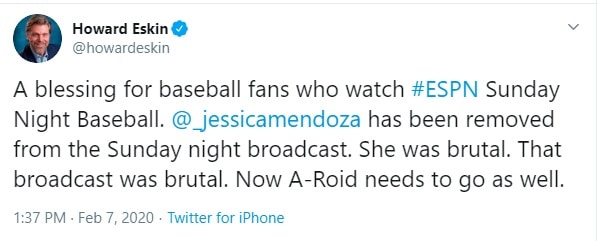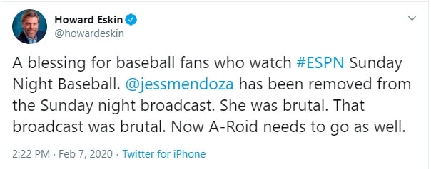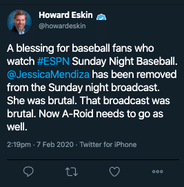 In turn, Howard Eskin, who made a career out of calling other people “dopes,” “morons,” and “nitwits,” took to Twitter to rip Mendoza, calling her “brutal” while also asking for “A-Roid” (Alex Rodriguez) to be removed from the Sunday night broadcast.