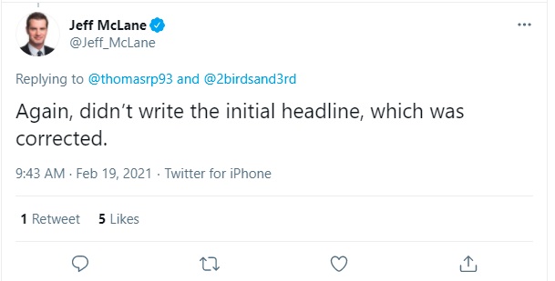 And that appears to be where the conversation ends. McLane replied to another Twitter user, saying that the “initial headline was a mistake and we corrected. Story stands, nonetheless.”