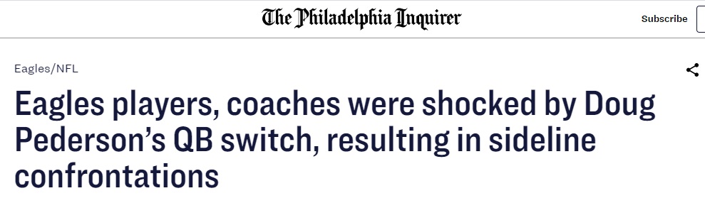 Some were angry. Two defensive players had to be held back from approaching Pederson. Center Jason Kelce and another offensive starter went to the coach to ask him why he had pulled the starting quarterback with the Eagles trailing by only three.