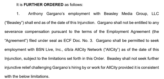 The injunction also says that Gargano cannot disclose confidential information obtained during his employment with Beasley, including ad pricing and rates, Beasley’s client list, ratings information, etc. He’s also prevented, for the next 18 months, from soliciting Beasley customers, advertisers, or employees. Essentially they’re listing out the clauses in his contract, like non-compete, non-solicitation, and exclusivity.