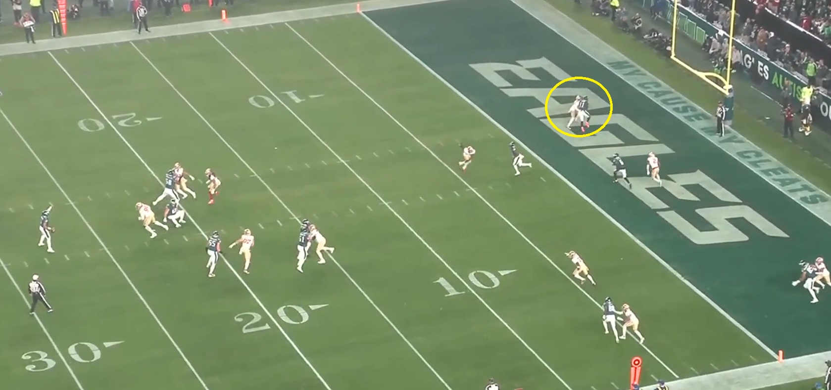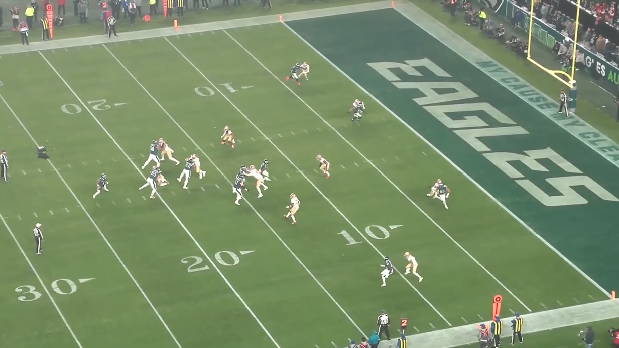 I said we were done with the Niners game, but I lied. One clip I want to share, which is the all-22 from the second drive when Jalen Hurts slipped and took a huge loss, forcing a field goal attempt:
