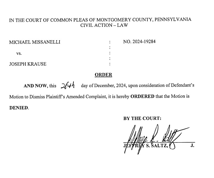 Missanelli is suing for what he says amounts to tens of thousands of dollars in unpaid compensation. Krause asked for the case to be tossed because Missanelli did not include the full employment agreement as evidence in his initial filing, submitting only two of the three pages. The judge gave Missanelli 14 days to refile with the complete contract, which he did, which then resulted in the denial of Krause’s motion.