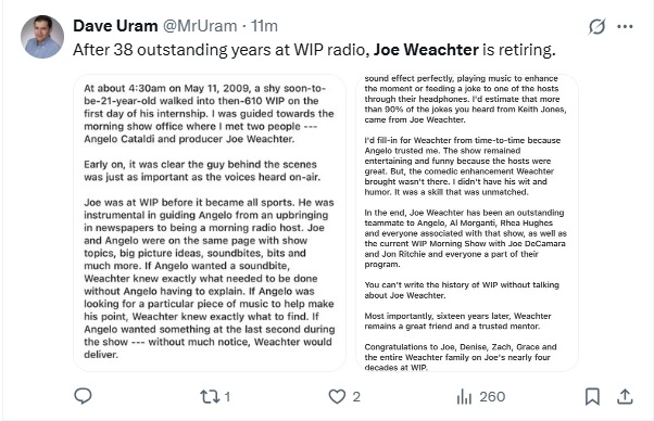 Also leaving is longtime WIP morning show producer Joe Weachter, whose retirement was announced on Monday morning. Weachter worked at WIP for almost 40 years and is seen as one of the key components to the success of Angelo Cataldi’s program. Staffers over there speak very highly of him and talk about the rapport he had with Cataldi, Al Morganti, Keith Jones, and Rhea Hughes, playing a significant role in turning that show into a decades-long ratings juggernaut and cash cow.