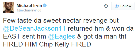 News Michael Irvin Says DeSean Got Chip Fired in an Incomprehensible Tweet Jim Adair • Dec 29th, 2015