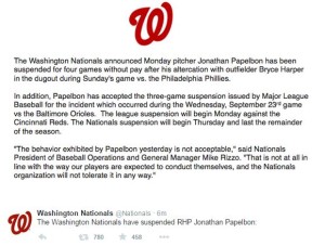News Joanthan Papelbon Has Earned Himself the Rare Double Suspension and His Season Is Over Jim Adair • Sep 28th, 2015