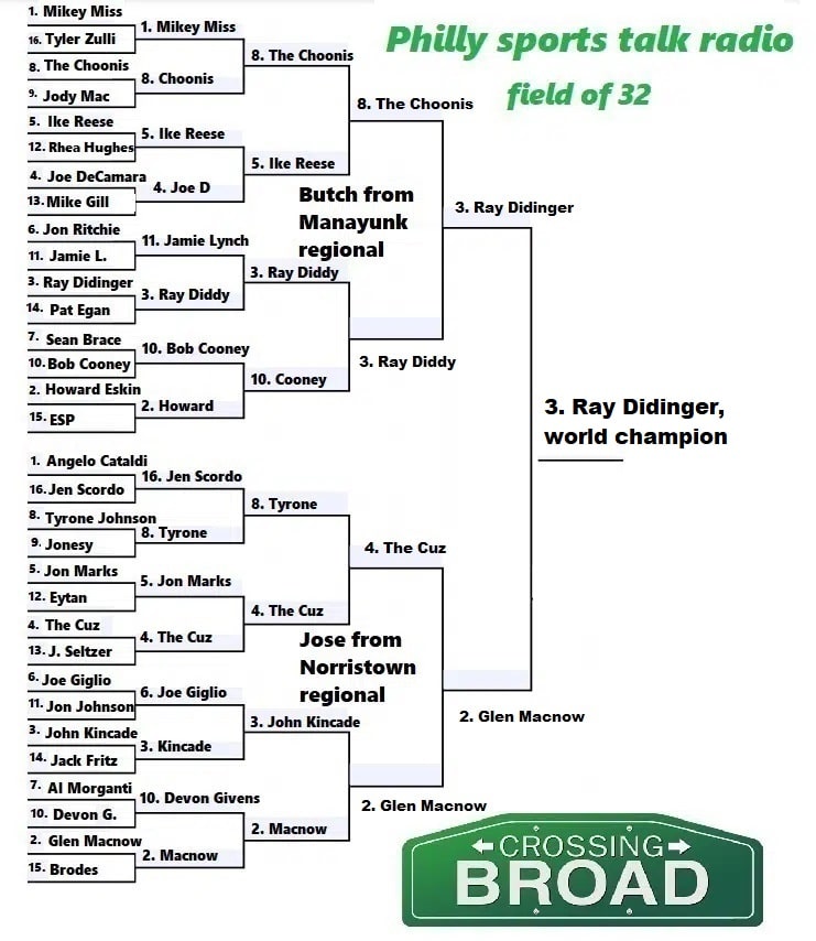 Anyway, thanks for participating. We like to have fun with these things. Nothing serious, though you see some egos begin to bulge when a harmless exercise like this finds its way to Twitter. Maybe next year we’ll go back to a field of 64 and pick another cool topic. Maybe we’ll do local television. With Jim Gardner retiring, I think Ukee Washington will have to be the #1 overall seed. Or maybe we’ll do a field of 64 for radio callers. I think Bernie from Broomall is a #1 seed, and INGY gets a play-in game against Eagles Shirley or Brother Scott from Barrington.
