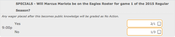 The Bovada Sportsbook has unveiled some pre-draft and free agency prop bets for NFL teams. For example, Jay Cutler has even odds on not being a Chicago Bear to start next season. DeMarco Murray has the same odds on leaving the Cowboys. And Bovada set 2/1 odds on the chance that Marcus Mariota will “be on the Eagles Roster for game 1 of the 2015 Regular Season.” If you put $100 on it, you win $200 (while if you put $100 on the more likely “no”, you win $33). And really, what’s the harm in throwing down like $20 on the Sal Pal train? It’s not even worth putting money on “no” unless you’re dropping big ducks bucks.