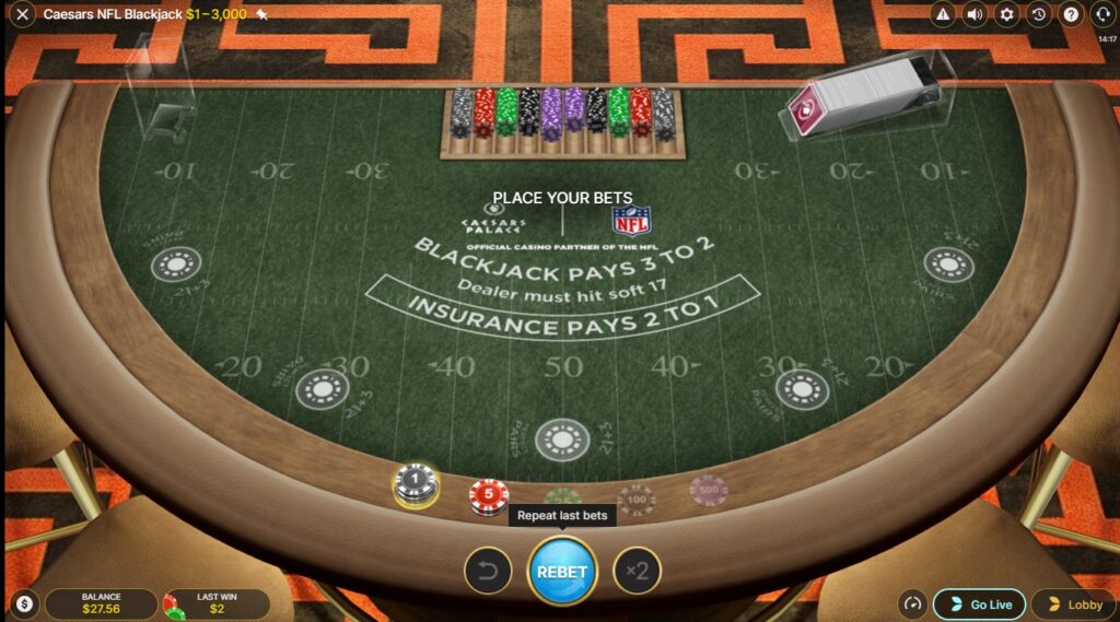 One of the available games at Caesars Palace Casino has a familiar feel for football fans, that is Caesars NFL First Person Blackjack.