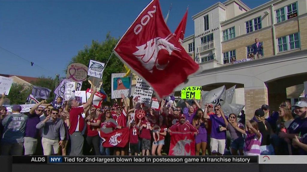 If you’ve watched College Gameday even once since 2003, you’ve noticed that there’s one specific flag that flies behind the set on every single Saturday morning. That’s “Ol’ Crimson,” the colors of Washington State University. You’ve seen it in Norman and Austin and State College and even on Independence Mall a few years ago when Temple hosted Notre Dame on Halloween night.