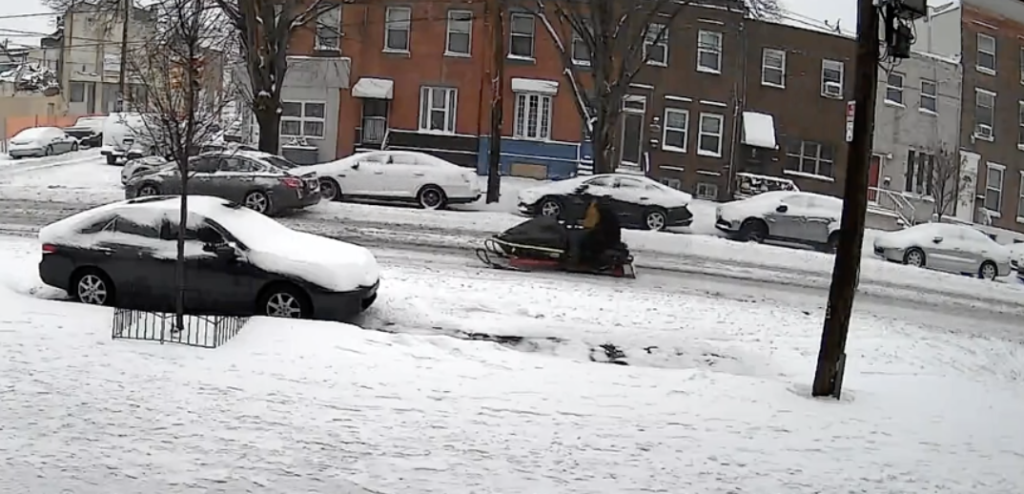 This video, recorded by a Ring doorbell and shared by Reddit user r/XiDa1125, shows ATVs and TWO snowmobiles riding through the streets of Philadelphia on Saturday:
