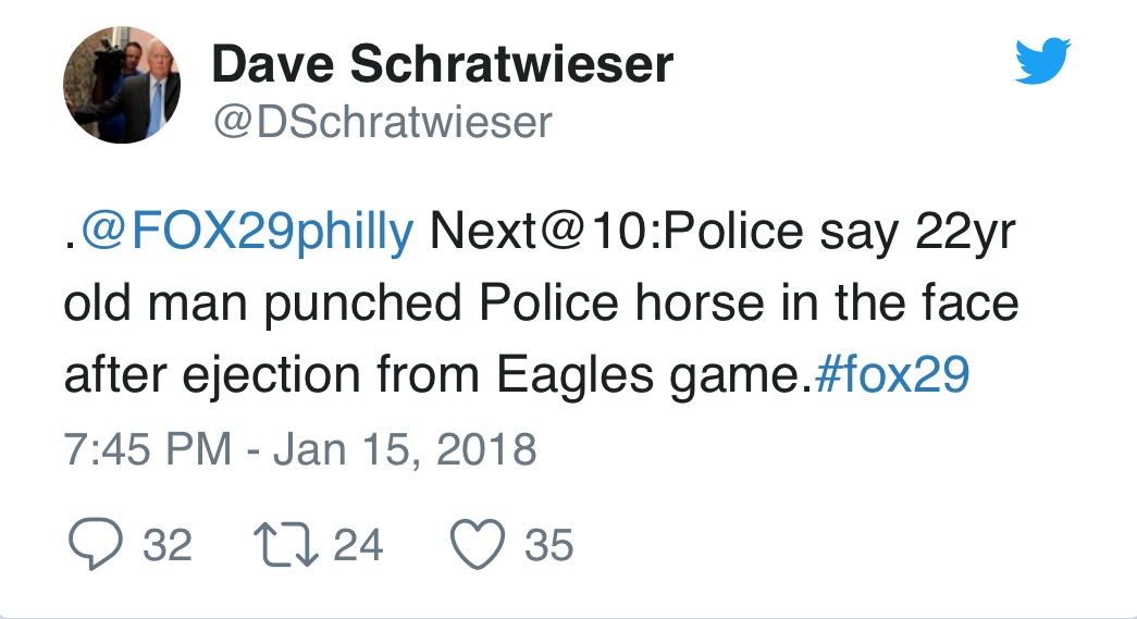Initially, I thought to myself, “This is probably much ado about nothing. I mean, what? An Eagles fan punched a horse!? In the face? Come on!” But when I saw two more subsequent tweets teasing the story for Monday night’s 10 O’Clock News, I figured I better tune in and check it out. And, uh, wouldn’t you know, according to police, that is exactly what happened. I don’t know why I’m surprised, but I am.
