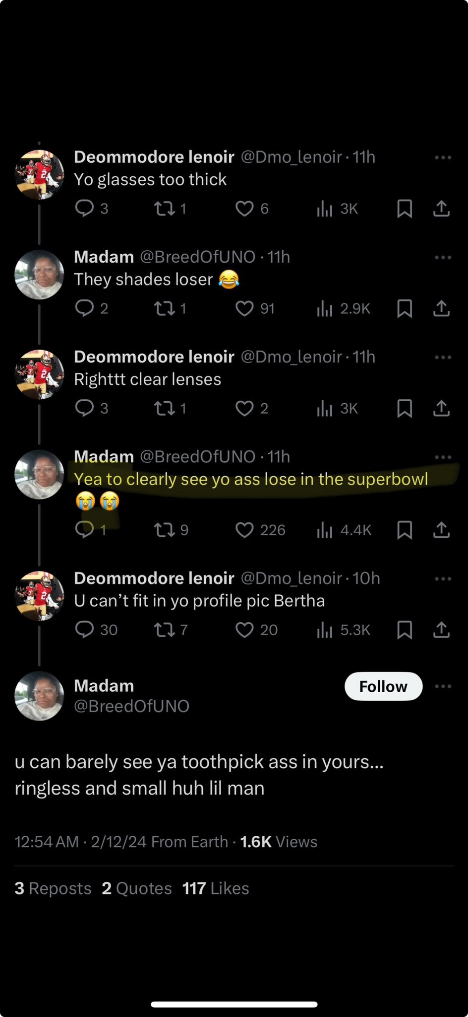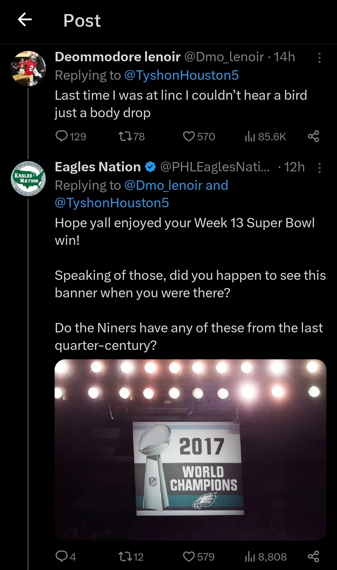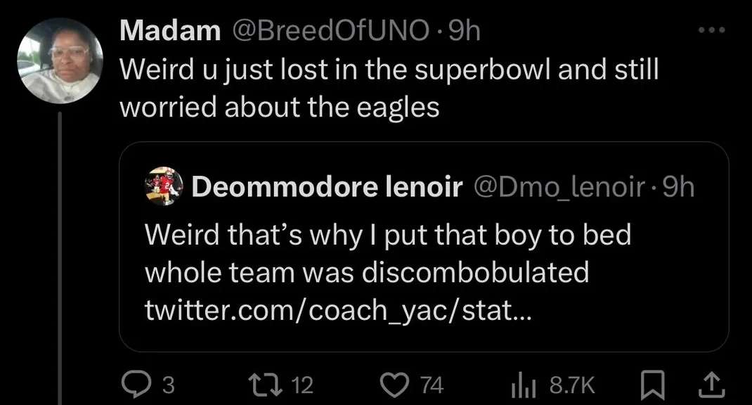 But thanks to Reddit user Mastermind208, we have screen grabs of deleted tweets showing Niners corner Deommodore Lenoir tangling with a random Eagles fan after the Super Bowl loss: