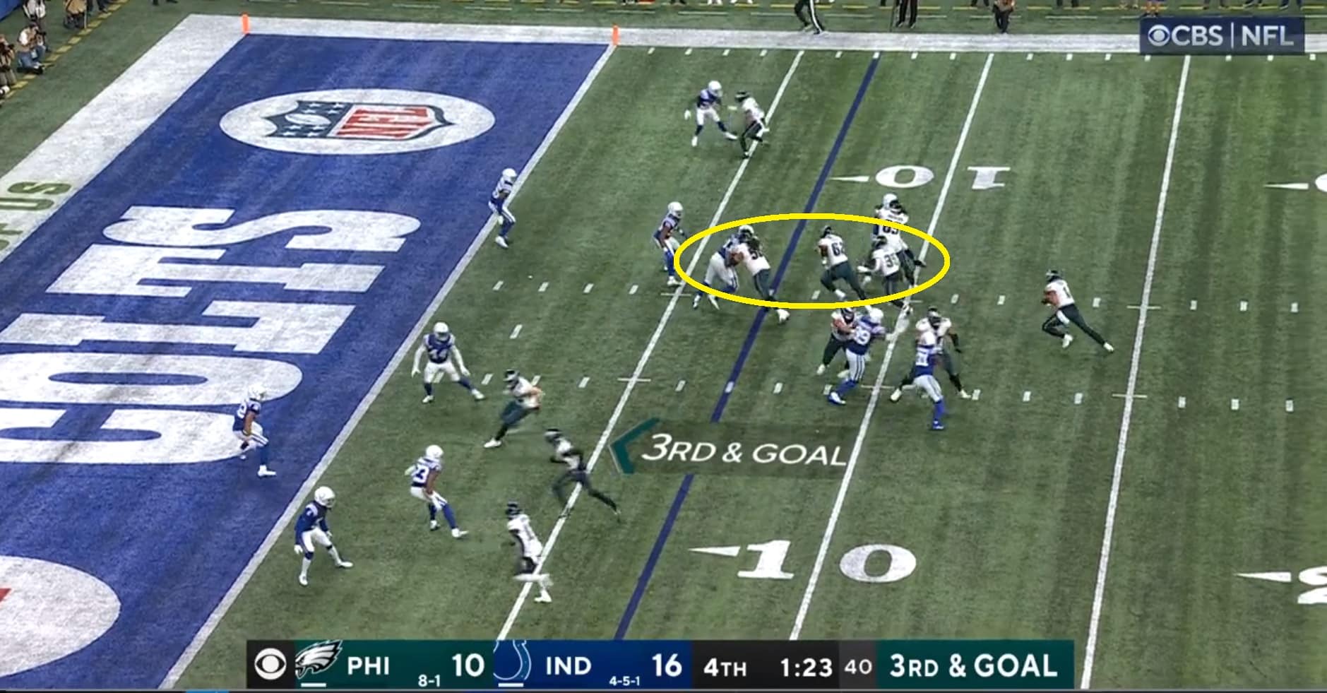 It’s an interesting play, isn’t it? The Colts are sitting in zone right there, and you typically expect designed QB draws like that to come from empty formations because that’s how you lighten the box and create some space to run. The Eagles were not in empty, however, and just threw a basic 11-personnel look out there with a running back, tight end, and three receivers.