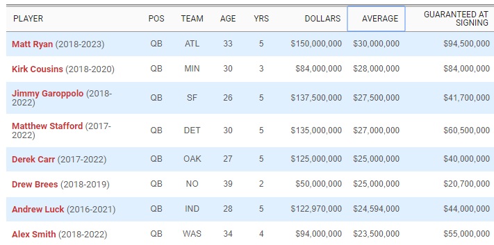 Rodgers will jump Matt Ryan to take the top spot. Ryan is getting almost $100m guaranteed in that deal. San Fran and Minnesota went for broke with Garoppolo and Cousins and Stafford and Carr signed big contracts that will take them through 2022. I don’t think any of those top five guys on the list are better than a healthy Wentz.