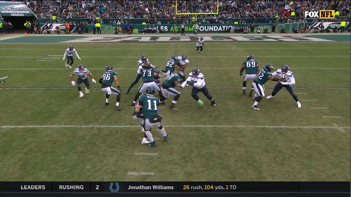 Later, they did something similar, trying to run a Goedert screen play behind the pair of backups on the right side. Big V whiffed and the play was blown up.