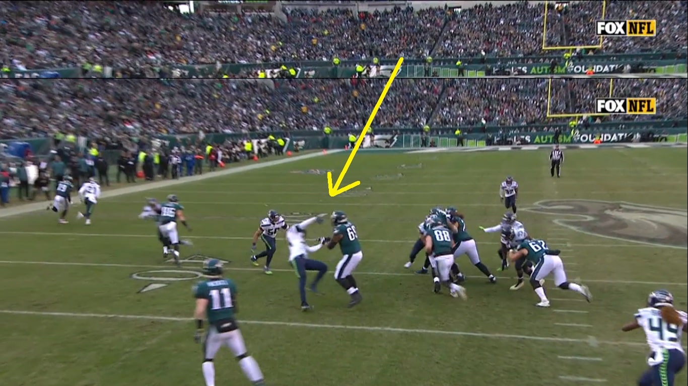Not sure whose fault that is. The Eagles’ timing looked off on a number of plays yesterday, and on this one Dillard ended up on his back while Wentz completely failed to see what was happening next to him.