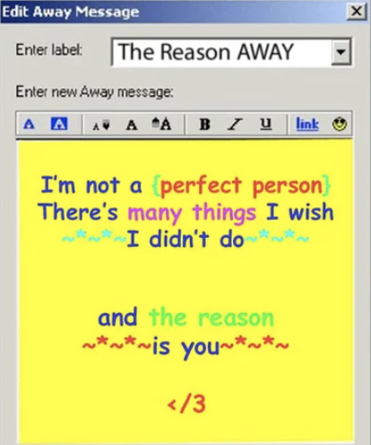 Remember how devastated you were when that girl you had a crush on put some guy’s initials in her profile or on her away message? It ruined your entire week. Then one day you go to check her profile for the hundredth time and his initials were gone followed by something emo like this: