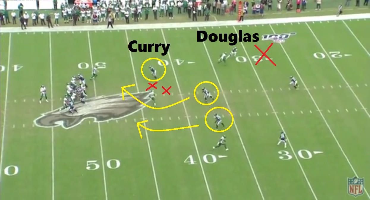 This is similar to the defense the Jets showed in the first clip. The only difference is that while the Eagles still drop the defensive end into coverage (Curry), they actually bring a linebacker into the play for a five man rush.