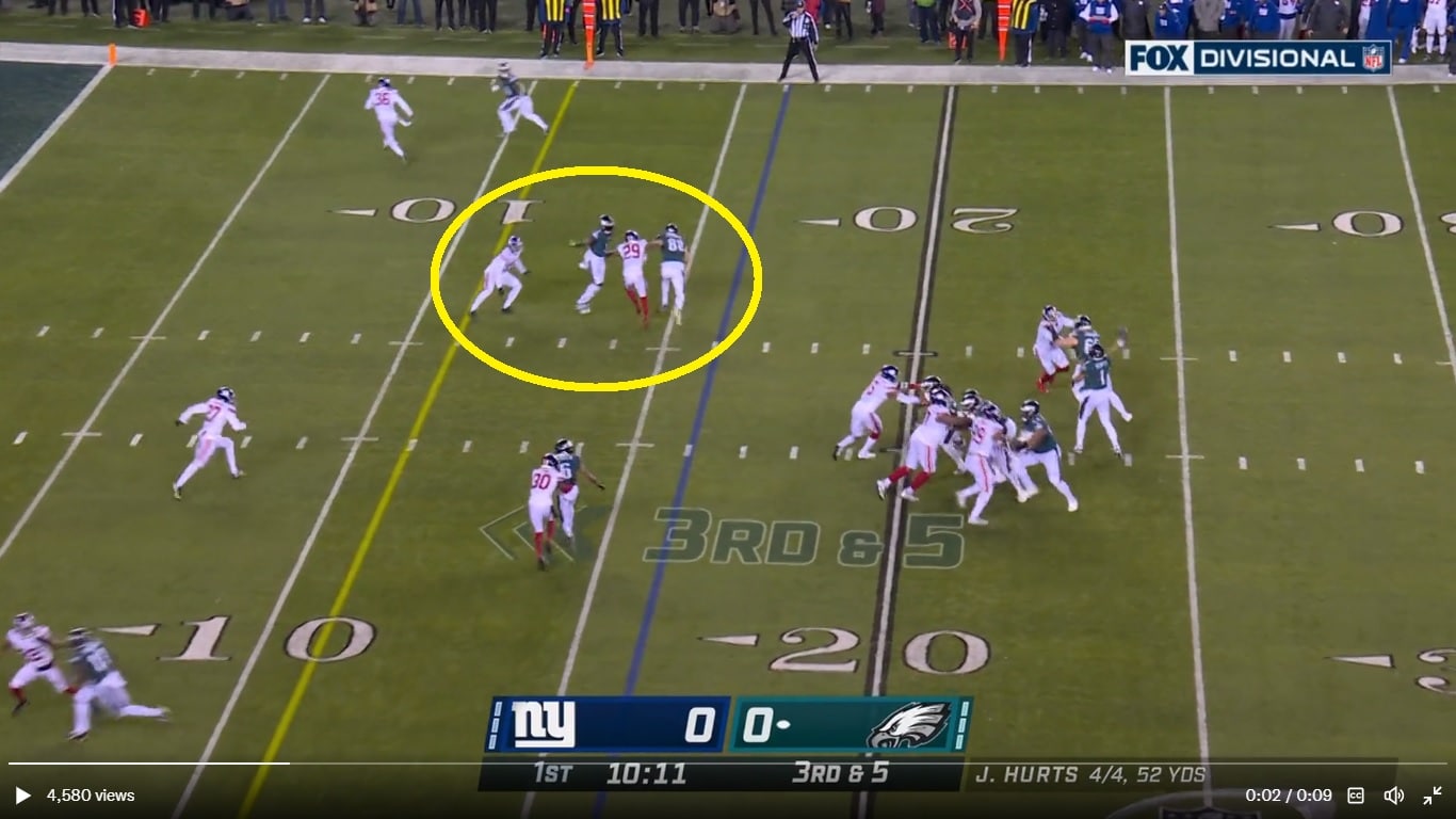 9) Another great Gannon call on the James Bradberry revenge pick, basically another zone wrinkle on the 5-man front with Reddick and Josh Sweat dropping into coverage, C.J. Gardner-Johnson blitzed from his SS spot, and then Bradberry jumped the hot route: