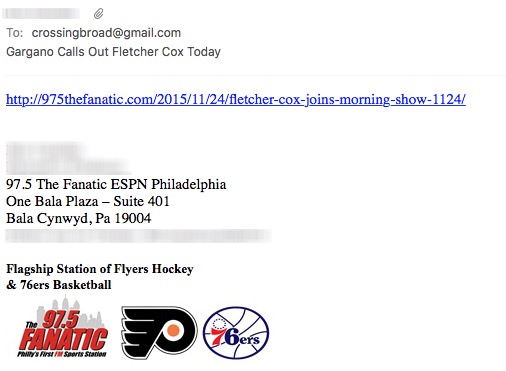 When you have a sports talk radio host telling one of the Eagles’ best players how he should behave on the field, it’s flat-out insulting. You can almost hear Cox rolling his eyes at the stuttering and mumbling of Gargano’s probing question, which he tried to punctuate with an “I’m just looking out for you” note. But Cox doesn’t need Gargano’s advice or his condescension. He (and you) can’t tell him how to act, and the faux-outrage over a dude flashing a smile isn’t going to make the argument swing your way.
