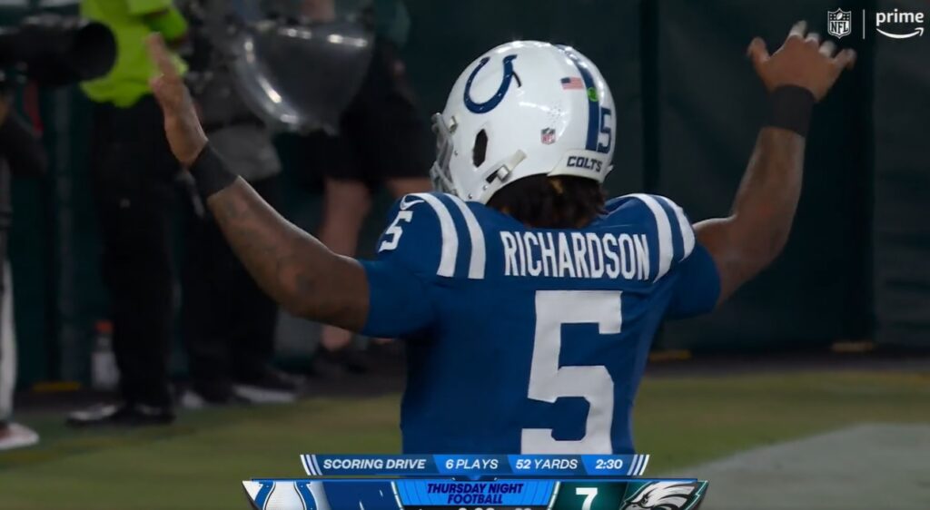 The best part about this is that Richardson didn’t even score the touchdown. Deon Jackson ran the ball three yards up the middle to cap off a six-play drive that started at midfield following a failed Eagles fourth down conversion. Indy went tempo, Richardson completed two passes and scrambled for six yards, then Shane Steichen ran it three straight times in the red zone before scoring.