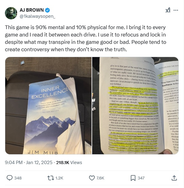 See now this is good because he’s getting out in front of it here and controlling the narrative. As soon as they showed him on the sideline reading a book, you knew someone was gonna run with the “A.J. is not focused” and/or “A.J. Brown is unhappy” storyline. That he’s not getting enough targets or isn’t dialed in or whatever people can come up. Perhaps they will push that thought regardless, the here’s bibliophile A.J. telling everyone that there’s no controversy.