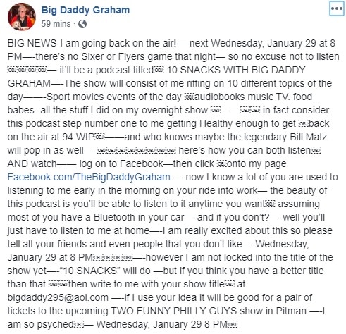 Longtime 94 WIP overnight host Big Daddy Graham is currently off the air as he recovers from a spinal bleed that left him partially paralyzed.