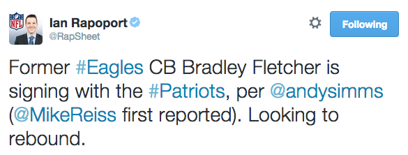 Bradley Fletcher, the football equivalent of that piece of bread that just made too much contact with the side of the toaster and came out more burnt than you ever expected, signed a one-year deal with the Patriots today. The deal is reportedly worth a maximum of $2.5 million, which is a sum I, as the Eagles, would have been happy to pay Bradley Fletcher to sign with the Patriots.