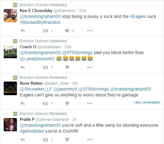 But on Twitter, where you can reach athletes directly, people sometimes go overboard. That’s why the block button exists. For when shit gets too real and nasty. All fair game for blockage. But, it seems, Brandon Graham is also adept at searching merely for mentions of his name – not handle – and blocking those people, whom he wouldn’t have otherwise known existed if he wasn’t so damn sensitive.