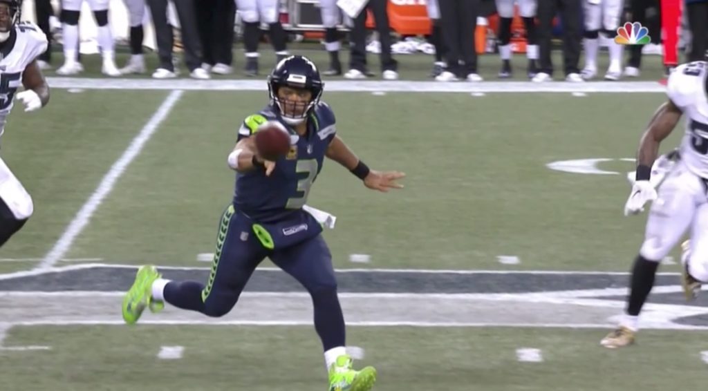 It’s a forward pass, no two ways about it. Though in real-time it looked legit due to the fact that Wilson appeared to throw the ball behind him and his blazing speed had him run out in front of the ball, even one replay provided enough evidence to consider a challenge.