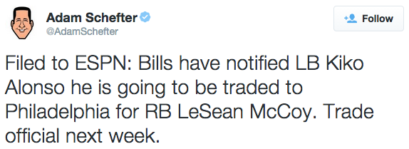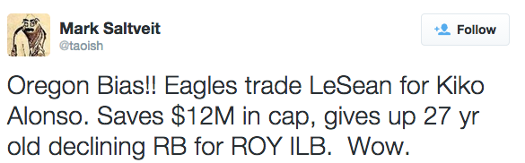 UPDATE 17: OK, thoughts: I HAVE NO FUCKING CLUE! I have no issue with trading McCoy. As I said, he’s about to hit a wall. That said, I know nothing about Kiko. He was defensive rookie of the year and seems to be highly thought of by Bills fans. His ACL injury came last July– he’ll have plenty of time to get healthy. But the Oregon thing is going to backfire spectacularly on Chip if his guys don’t pan out. He’s putting this all on his shoulders right now. I like the boldness. Love it. But… yeah, bold. Still a lot of offseason to go. Can’t fully judge it yet. I’m sure local media will try, though.