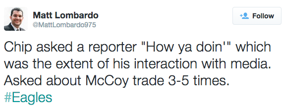 UPDATE 18: Chip reading My Pet Goat at a dinner in New Jersey right now as Eagles nation burns around him: