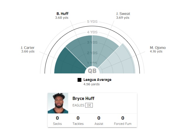 Combined, Huff, Josh Sweat, Brandon Graham, and Nolan Smith finished with 1 QB hit, 0 sacks, 0 TFL, and 0 pass break ups. They did nothing. Couldn’t get within arm’s reach. Just to be sure, I went through the entire game log and manually searched “Huff,” but nothing popped up. No solo tackles, no assisted tackles. A total donut.