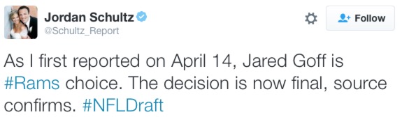 According to Huffington Post’s sports reporter Jordan Schultz (…), Jared Goff will be the Rams’ pick. That leaves Carson Wentz to the Eagles at #2 in an expected but as of yet unconfirmed start to Thursday’s draft.