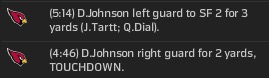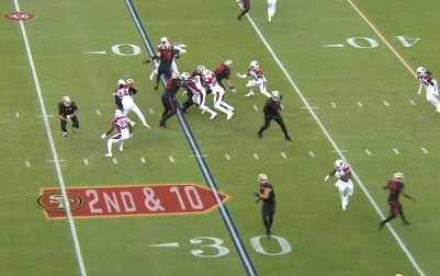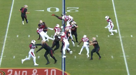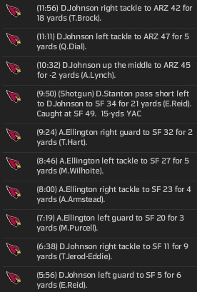 What’s more, as we’ve seen already with Doug Pederson, time of possession (or snaps, if you prefer) does matter. It matters for the defense. Last night time of possession was fairly even, but sure enough, to the everlasting delight of my Cardinals stack on Draft Kings, the 49ers’ defense was gassed by the fourth quarter and allowed the Cardinals to run the ball down their throats to seal the game. I mean, LOOK AT THIS: