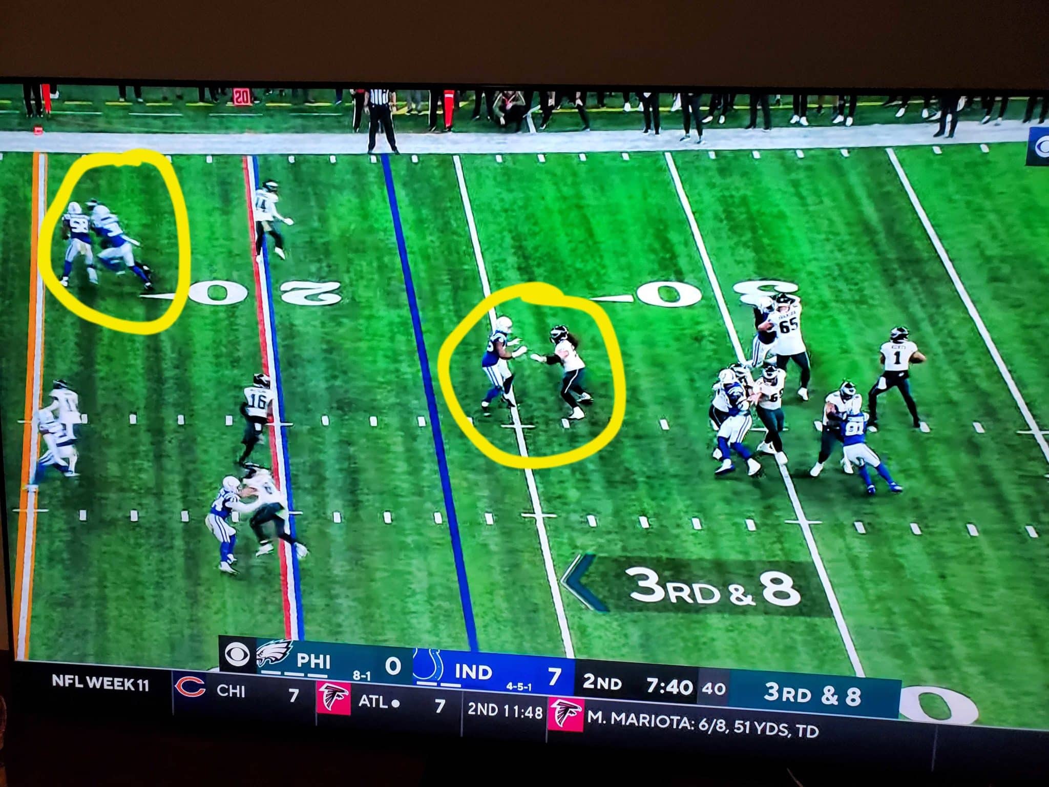 12) On the first Eagles’ scoring drive, Indy really blew that 3rd and 8 sequence. They rushed three, dropped a linebacker as a QB spy, and then they had a blown coverage on the back end as well: