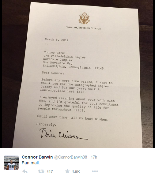 Even though he met him last fall, a letter from Bill Clinton is probably the last piece of mail Connor Barwin expected to receive when Howie Roseman pushed the mail cart down the hallway at NovaCare. It looks like Chelsea may be converting Bill.