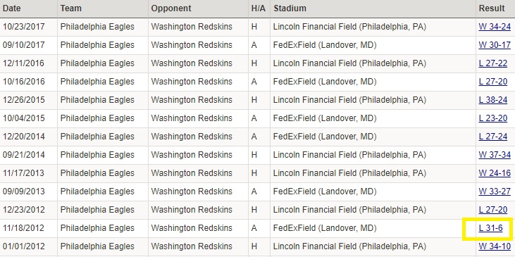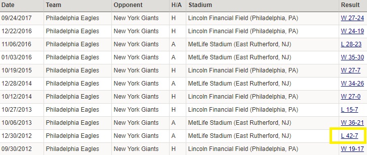 That 12/30/2012 game was the Andy Reid lame duck tour, when the Birds got absolutely clobbered in the Meadowlands. Chip Kelly had an easy win in his second year, but you see a lot of 3 and 5 point games in there.
