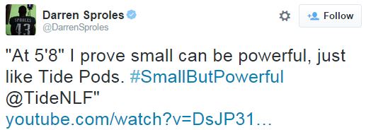 Whoever runs Darren Sproles’ twitter account better watch his Tide Pods ad or check his height, because the dude is 5’6″, as the ad says. Or maybe, being a short guy, Sproles just gives himself a few inches when he can.